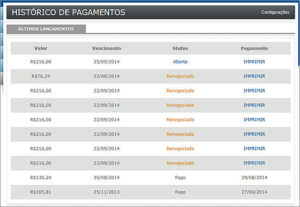 Nesta área você vai encontrar o histórico de pagamentos, com os valores, vencimentos, status e data do pagamento. No caso dos boletos com status Aberto você poderá imprimir diretamente do sistema, agilizando o processo de cobrança, sem precisar solicitar um novo boleto.