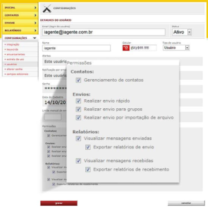 No IAGENTEsms implementamos mais um recurso que são as permissões por usuários. Funciona da seguinte forma: todo usuário administrador pode criar um usuário padrão e configurar as permissões para o acesso as áreas do sistema. Este recurso visa principalmente a segurança do sistema.